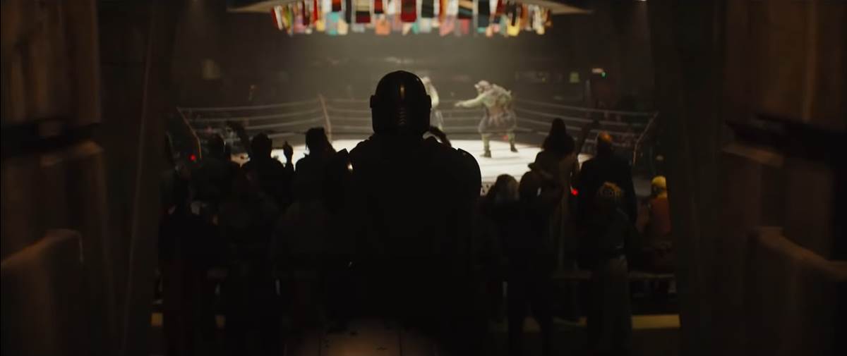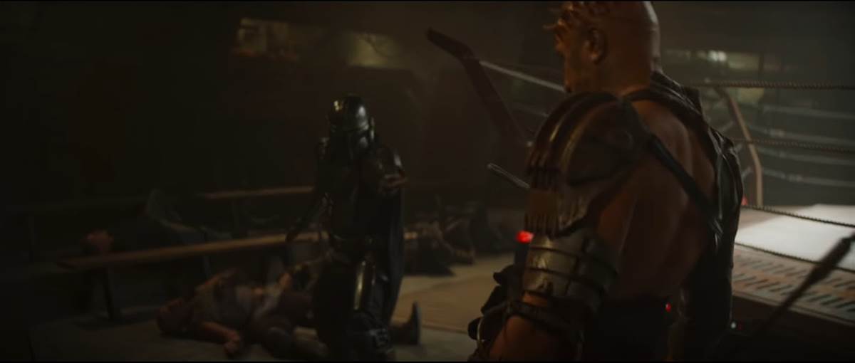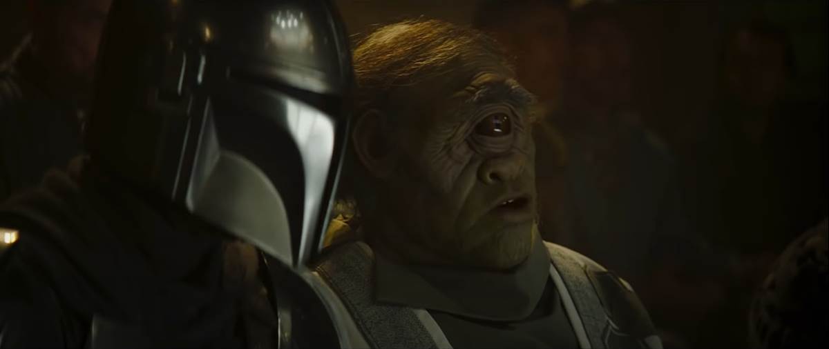SHOT 37: Djarin is watching the match with a member of the one-eyed Abyssin species (first seen in Mos Eisley Cantina in the original Star Wars film).
