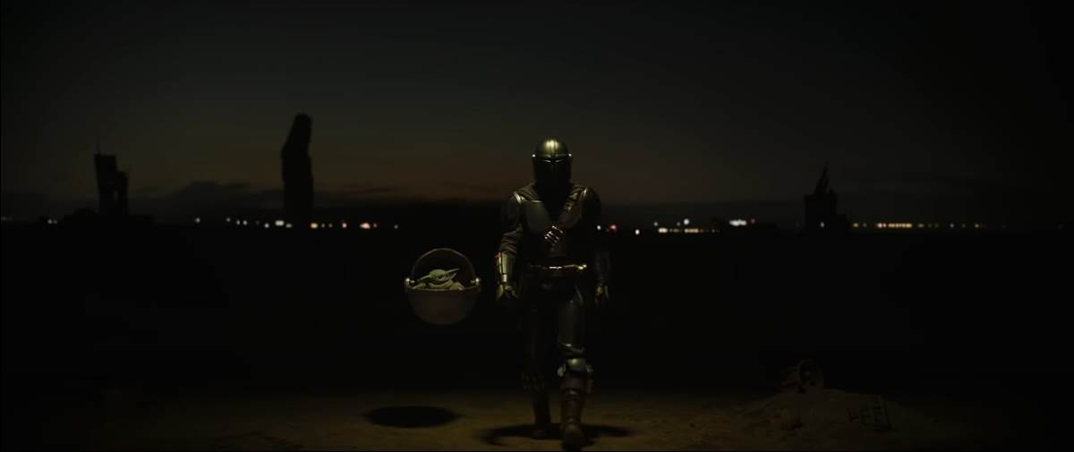 SHOT 3: In silhouette against a planetside backdrop at dusk with several spires or towers jutting up among the lights of settlements in the background, the Mandalorian (Pedro Pascal) walks toward the camera determinedly, with the Child in his floating pram beside the bounty hunter.