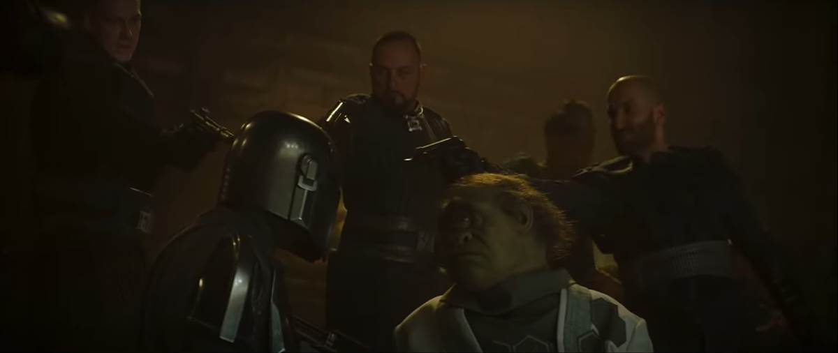 We hear an unknown character say “You know this is no place for a child.” This sounds like The Mandalorian creator and showrunner Jon Favreau’s voice. Favreau has already played several characters across the Star Wars canon, but this is a new one.