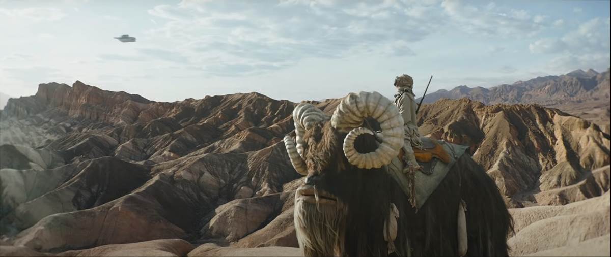 SHOT 5: A Tusken Raider riding on a Bantha watches the Razor Crest fly over the rocky desert surface of what is likely Tatooine (as Tuskens are native to that planet, and Djarin has visited there before).