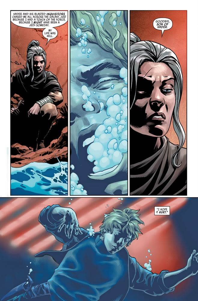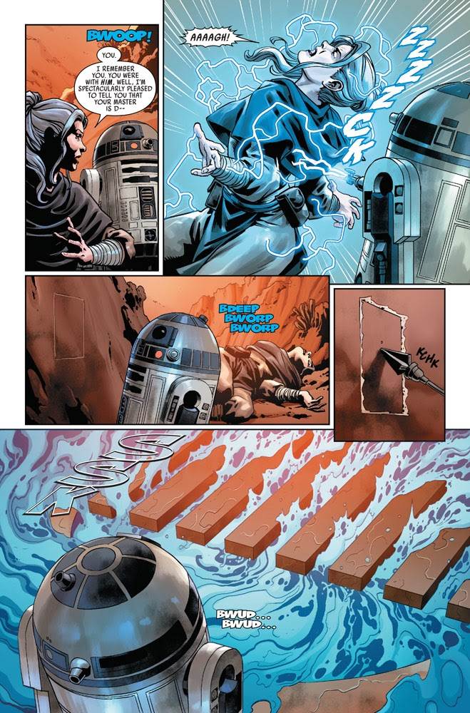 Verla is understandably fed up with the concept of the Jedi Order, and this issue goes a long way in retroactively setting up Luke’s self-imposed exile to Ahch-To in the Star Wars prequel trilogy. After escaping Verla’s traps (intended for the Sith Inquisitors who have hunted her most of her life) thanks to a shockingly helpful R2-D2, the two have a long chat about destiny and the Force, and Luke’s attitude toward the Jedi on display here serves as a clear-cut juxtaposition to both his new acquaintance and his future self.