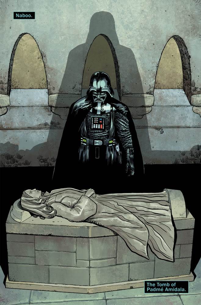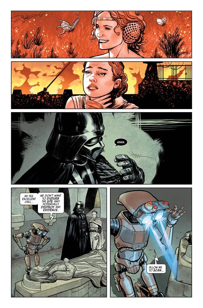 The Sith Lord formerly known as Anakin Skywalker’s quest for the truth about Padme Amidala’s death nears its climax in Star Wars: Darth Vader #5, which hit store shelves today from Marvel Comics. Still on Naboo, Vader visits his deceased wife’s crypt and (with the help of hapless forensic droid ZED-6-7) finds a medical implant that sends him to the next location on his mission: the asteroid field of Polis Massa, where Padmé famously gave birth to the twins Luke and Leia in Star Wars: Episode III - Revenge of the Sith.