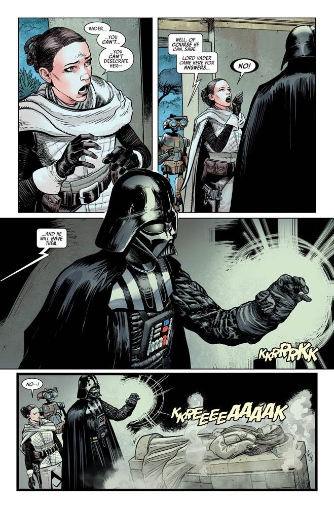 Thanks to the vibrant art by Raffaele Ienco, Vader is still getting vivid red-tinted flashbacks to the prequel trilogy and the events leading up to Padmé’s death, and this keeps happening throughout his investigation of the former rebel base where he and ZED come upon the particulars of that fateful event-- from Obi-Wan’s ship landing with Padmé and two droids all the way through to the moments after the birth (though obviously he doesn’t see that there are two babies- and doesn’t find out about Leia’s heritage until he reads Luke’s thoughts in Return of the Jedi).