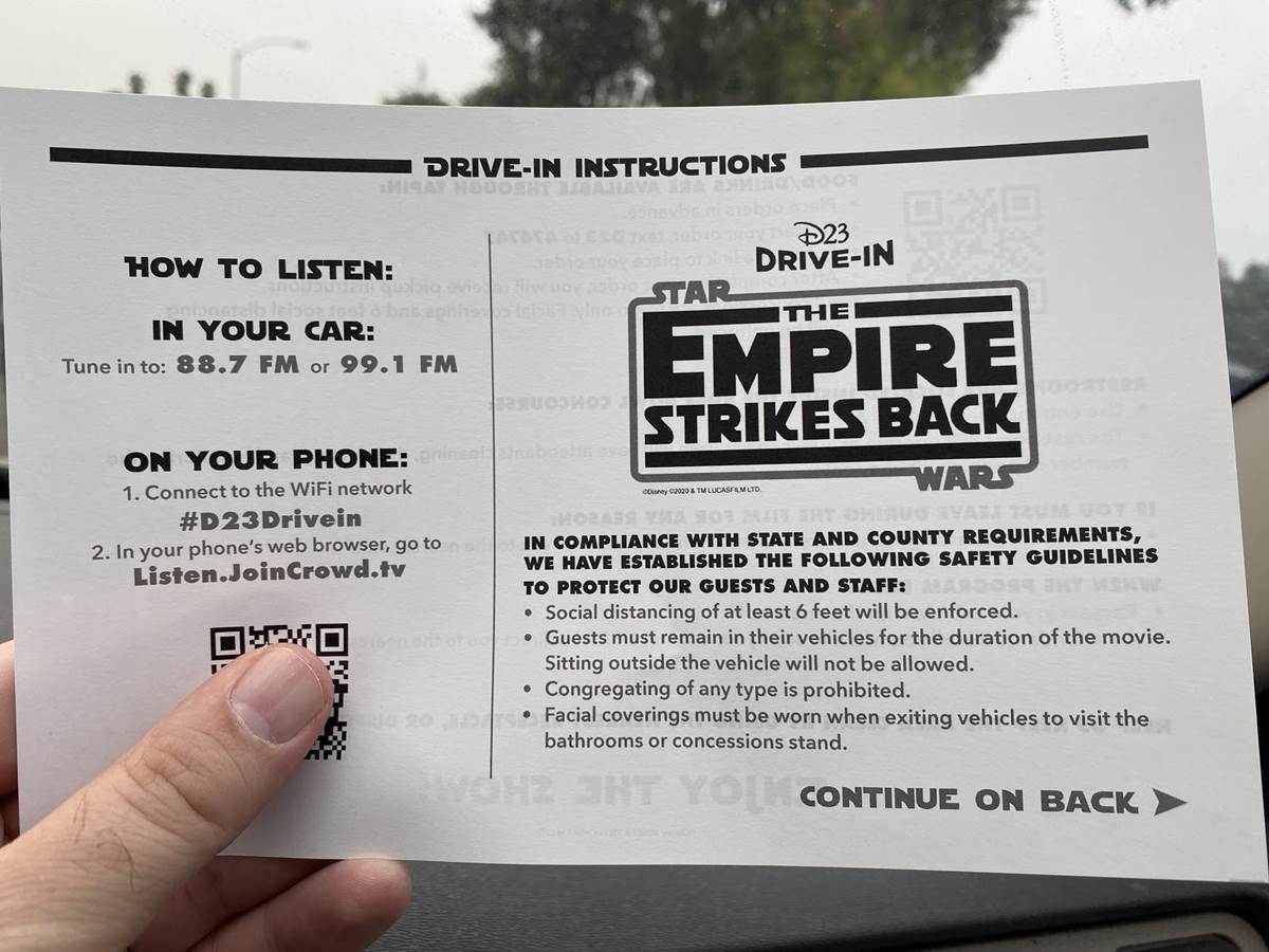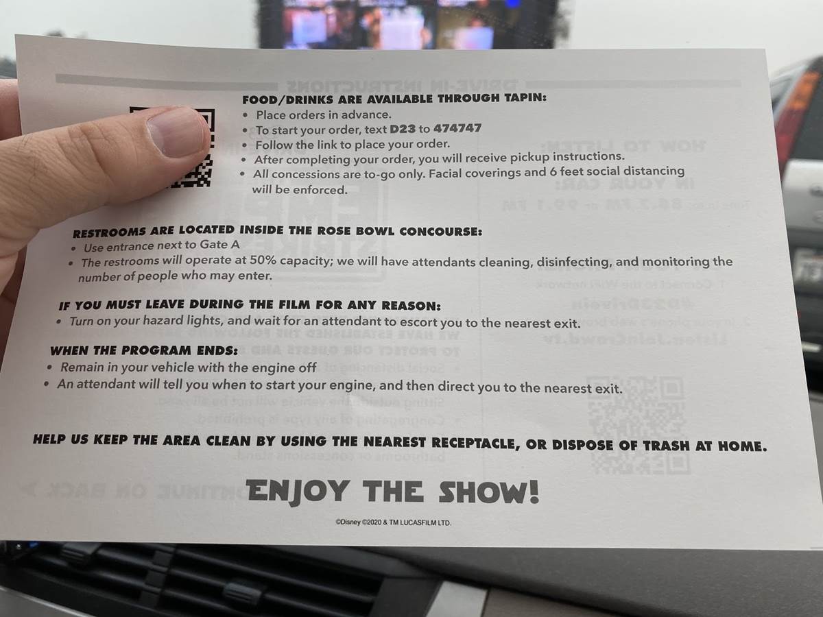 When we arrived at the Rose Bowl on Friday evening, we were handed an informational flyer that listed the rules and regulations for this drive-in experience, plus provided instructions on how to tune in our car radio to the film’s soundtrack.