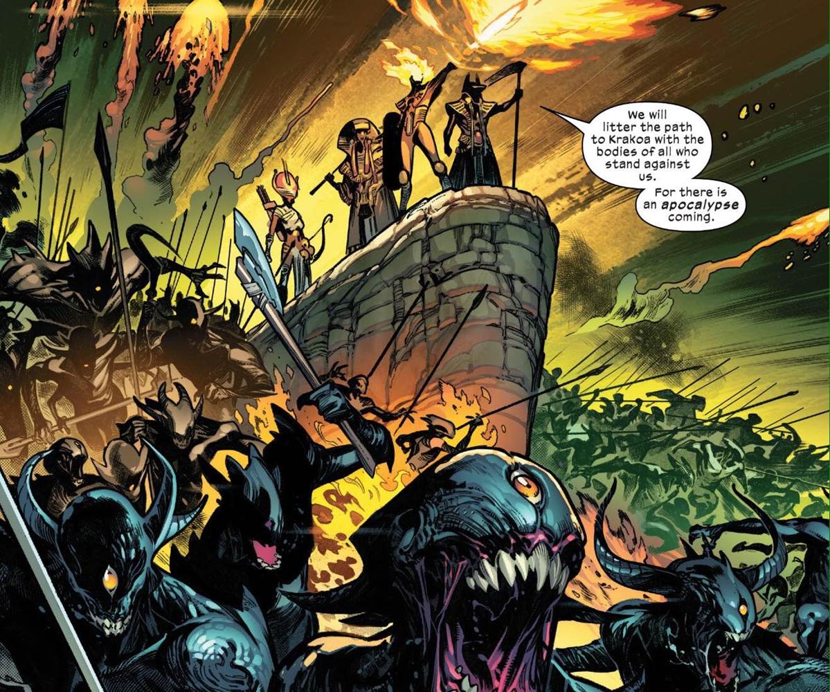 Whereas Apocalypse was once the one to attempt to take on every Mutant and claim the world as his, he is now the one who will lead the Mutants to fight to protect it. With the approval of Krakoa iself, but not the approval of its council, he takes a team of mutants to Otherworld to stop this war before it starts.