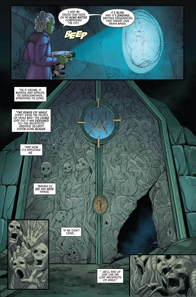 I’ve said in other recent reviews of this Doctor Aphra comic how much I appreciate that the series has returned to the character’s archaeological roots, continuing Aphra’s growing legacy as the Indiana Jones of the Star Wars universe. That trend continues in issue #4, as the good doctor and company must make their way through the catacombs while avoiding the siren call of the living city of Vaale’s built-in security system, which drives invaders mad through an aural attack on their brain waves. Along the way I’ve really come to admire the detail that artist Marika Cresta is putting into her work for this title. Her evocative background and landscape drawings have a terrific way of conveying the desolation and ominous nature of Vaale, while her renderings of the comic’s characters make them all individually unique in their facial expressions and physical tics.