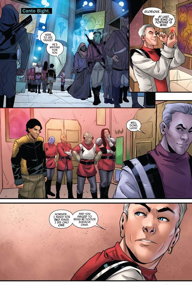 At the end of last month’s issue, Aphra and a couple of her teammates were double-crossed by two other members of the group that she accompanied to the eerily abandoned planet Dianth in search of the fabled Rings of Vaale. Now the turncoat assassin Just Lucky has trapped Aphra and her remaining allies (plus Detta Yao, the other traitor) in the Vaale catacombs, and they must find a way out before Lucky can deliver the Ring of Fortune to Ronen Tagge, a devious aristocrat who takes pleasure in being the last person to touch ancient artifacts before he destroys them.