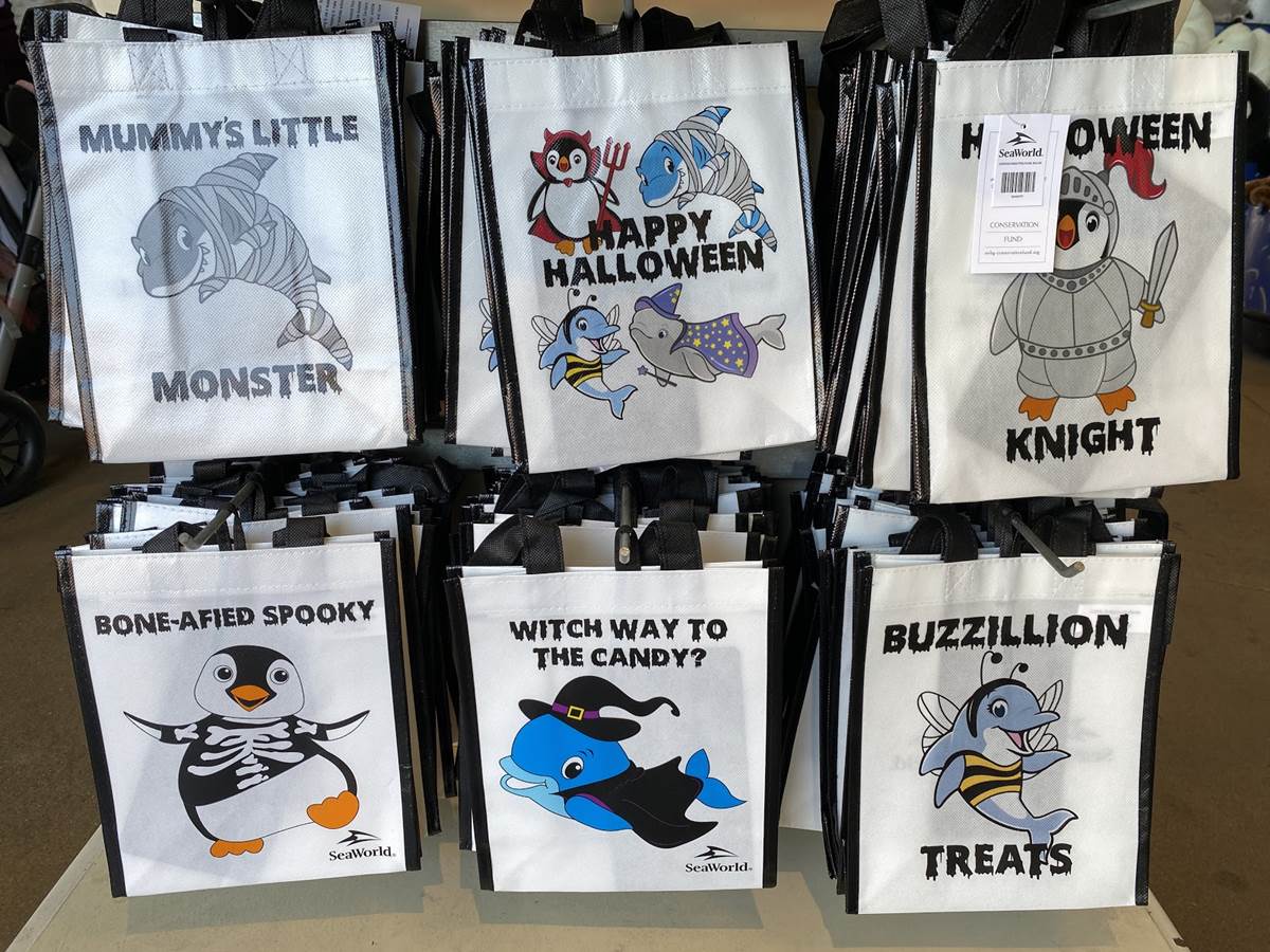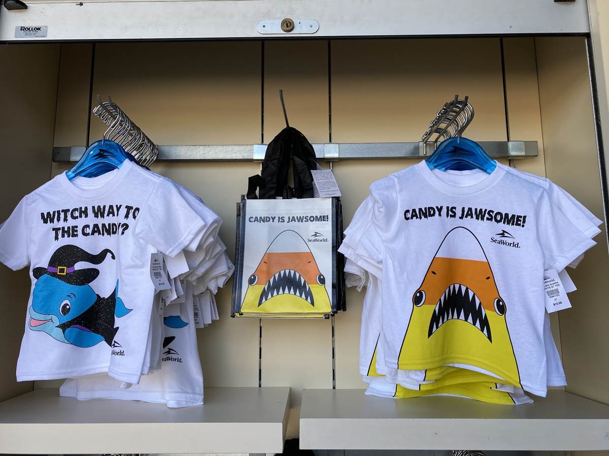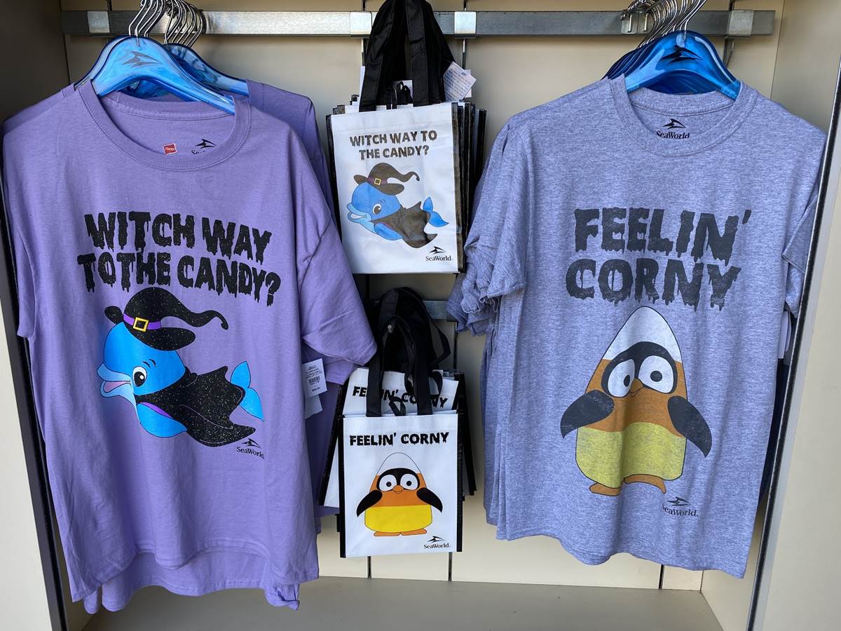 Of course, no visit to a theme park during any particular holiday season would be complete without picking up some fun themed merchandise, like these SeaWorld Halloween Spooktacular t-shirts and trick-or-treat bags.