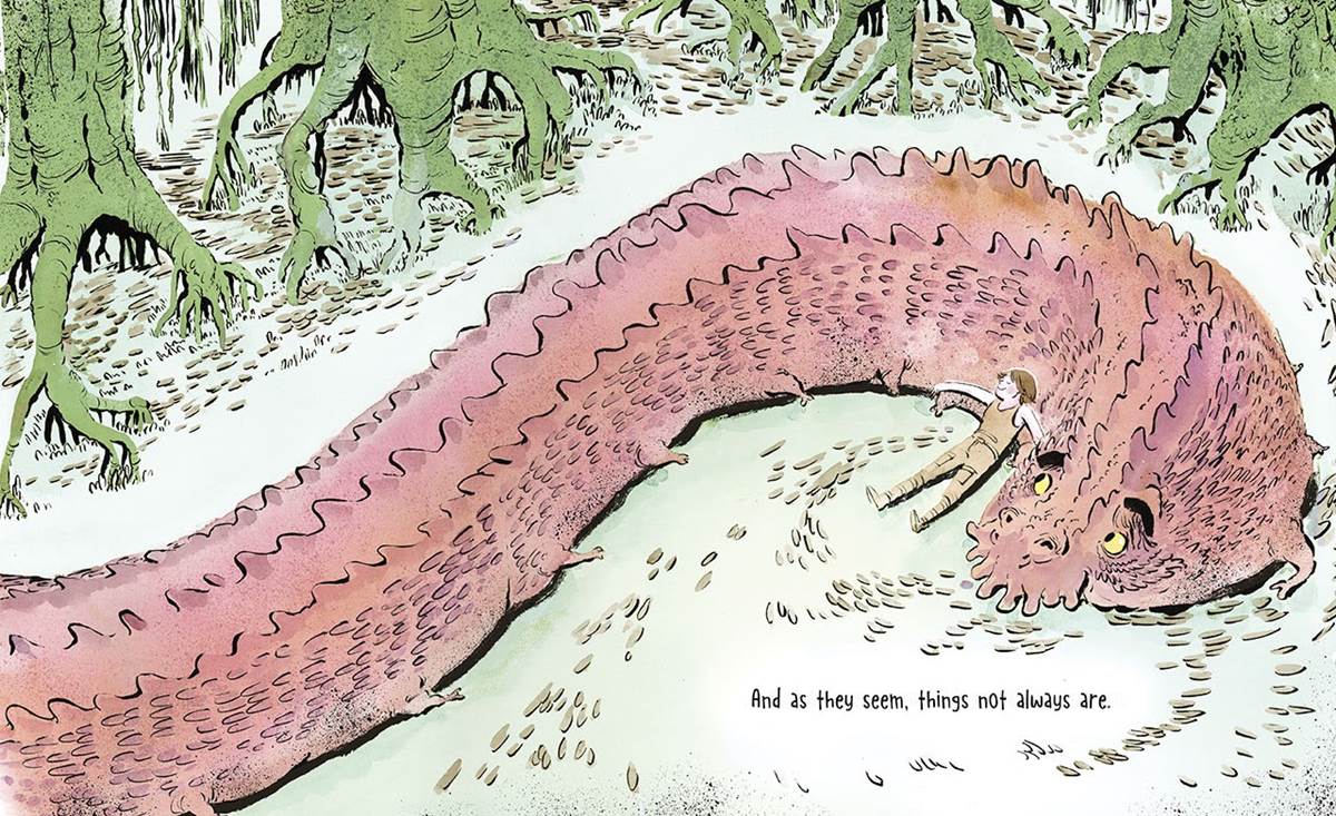 Chhibber: [laughs] I have not named them. I guess we should. I know at least one of them-- the big reptilian-looking thing-- is actually from another middle-grade book. Mike actually told me [that]. I wasn’t aware. [With] the very little cute ones, my note was ‘little creature goes here. I think he looks like a quokka.’ [laughs] Those were the level of notes I gave Mike, and then he came back with this really cute little alien that looks like a quokka, which I think is so inviting. That was very cool to get to contribute.