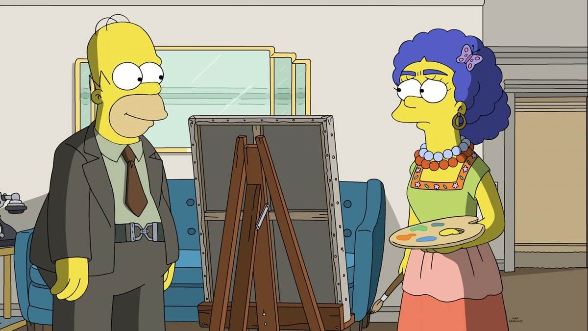 J.D. hires Rivera to create art for Rockefeller Center, and then Frida accuses Diego of selling out. She wonders what she will do while he works on his murals for the new buildings. Diego returns from “a crazy night” with the Marx Brothers to find that Frida has painted some very striking self-portraits. He calls her a genius and says he will show how in awe he is of her by starting to sleep with other women, starting an hour ago. At the unveiling of Rockefeller Center, J.D. unveils Rivera’s famous mural depicting Vladimir Lenin. Rockefeller demands that Rivera paint over the mural, and he refuses, saying there’s only one person he wants to be proud of him. J.D. releases the hounds, but they’re stuck on the 66th floor waiting for the elevator. Flashing back to the present, Lisa says Frida Kahlo became more famous than Diego Rivera.