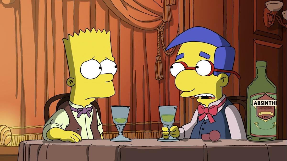 Back in Lisa’s room in the present, Lisa tells Bart (also Cartwright) the story of another artist in Paris. Principal Skinner (Shearer) is teaching an art class, and brings in Barney (Castellaneta) as a model. Bart draws an abstract sketch and upsets Skinner. “Since you refuse to paint the still life, you’ll become the still life.” Later, the kids are out at the Moulin Rouge, where they meet “Toulouse Moetrec” (Azaria), who inspires them to follow their passions in their art. The next day, Skinner unveils the newly painted art to Superintendent Chalmers (Azaria), who is shocked by their daring approaches and refuses to show it to the visiting emperor. Homer (Castellanetta) and Marge show up as the emperor and empress and the kids hide in a giant wheel of cheese so they can sneak in and present their art to the royal couple. After being impressed, empress Marge orders both Skinner and Chalmers beheaded.