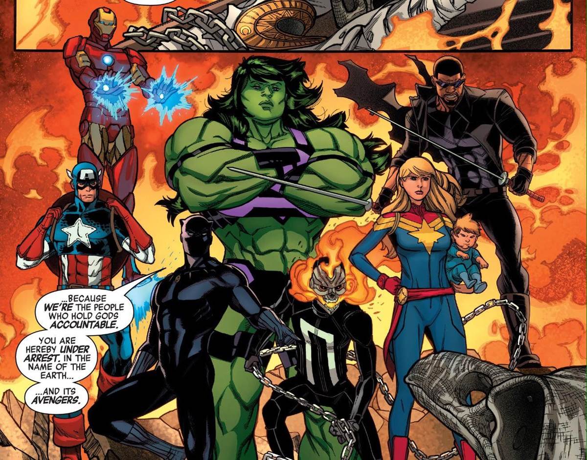 On top of that, the armies of Khonshu have been terrorizing the masses and keeping the Avengers at bay. Captain America, Blade and She-Hulk have been trying to rescue the captive Black Panther, while Iron Man and Captain Marvel have been trying to keep the new Starbrand from joining Khonshu’s arsenal.