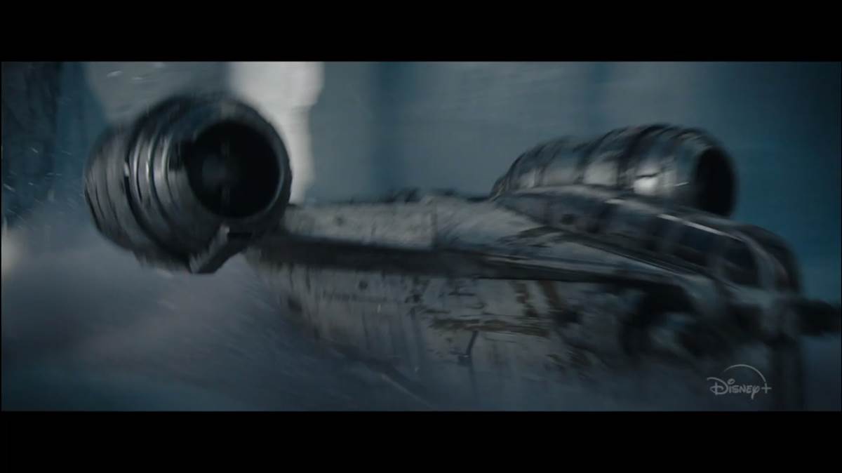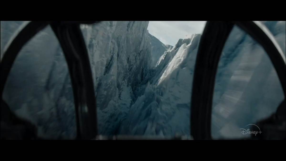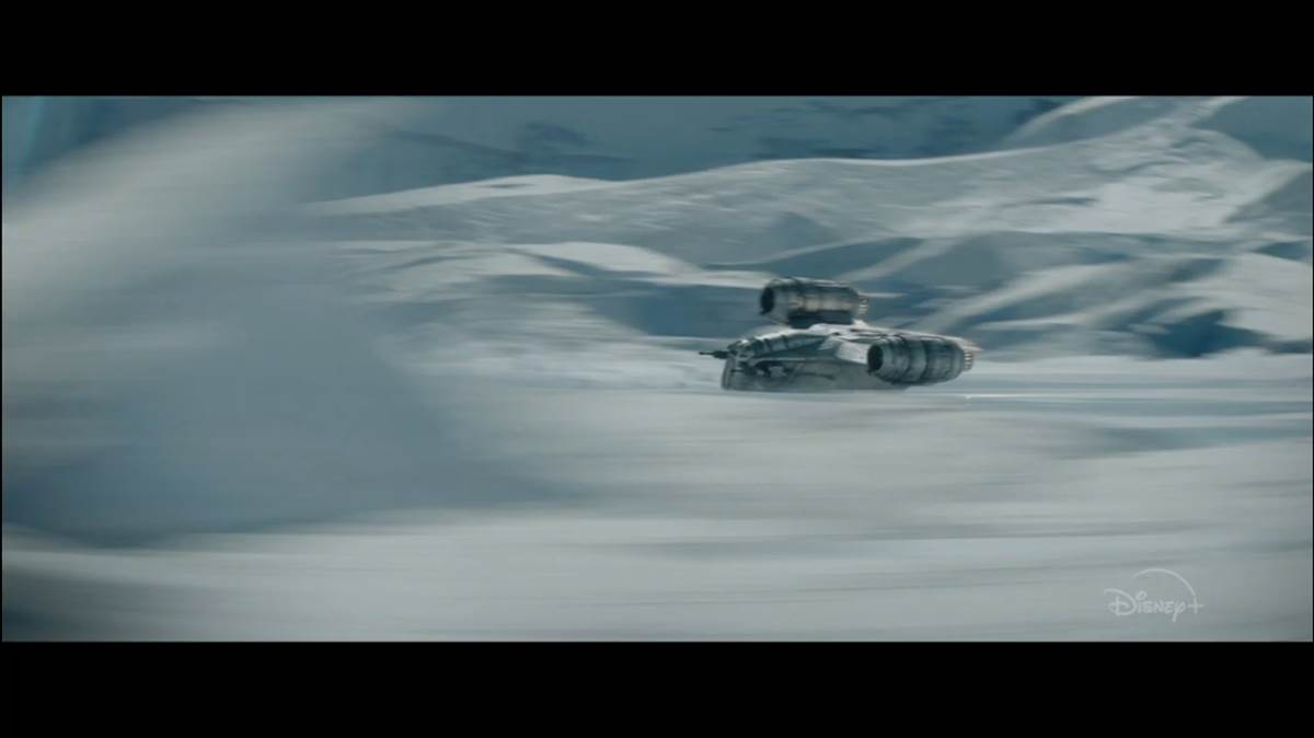 In a POV shot from the ship’s cockpit, the Razor Crest careens through the canyons of the ice planet seen in the previous trailer.
