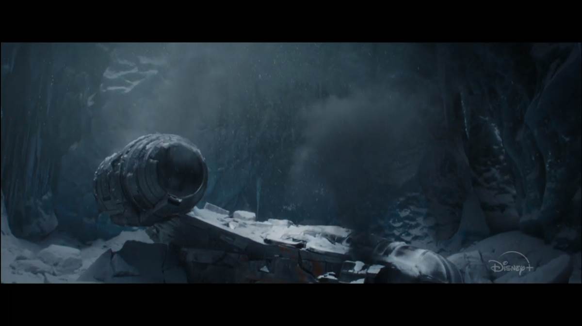 The Razor Crest is in bad shape after having come to rest in a cave on the ice planet.