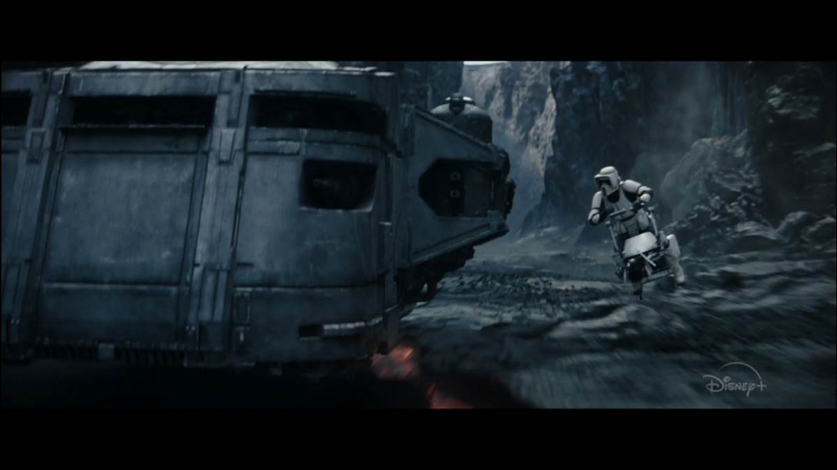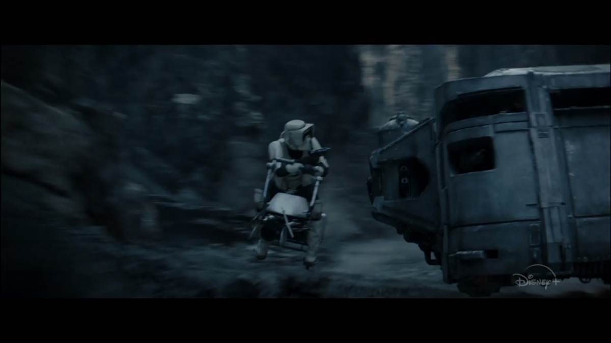 One of the Scout Troopers attempts to get alongside the speeding transport in the canyon below.