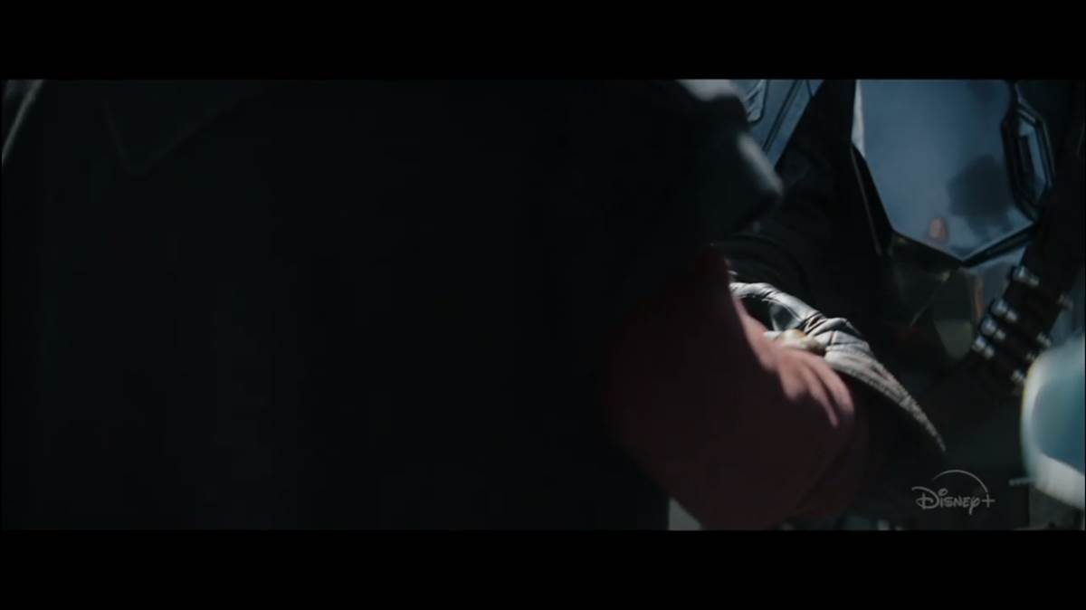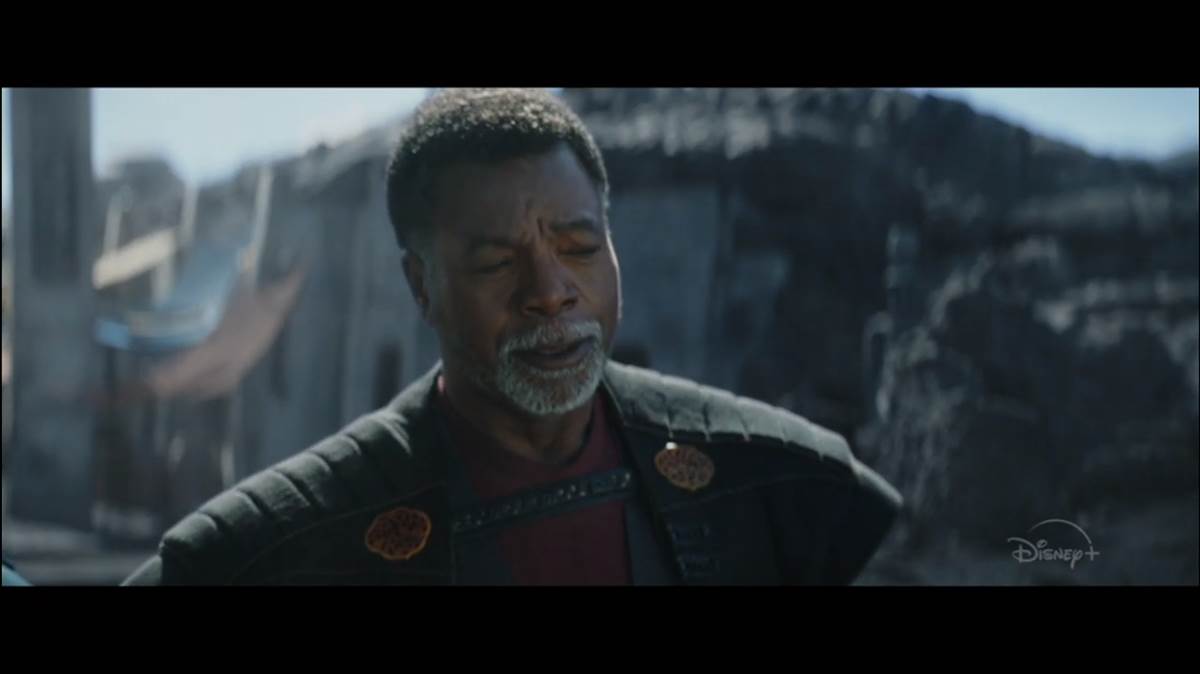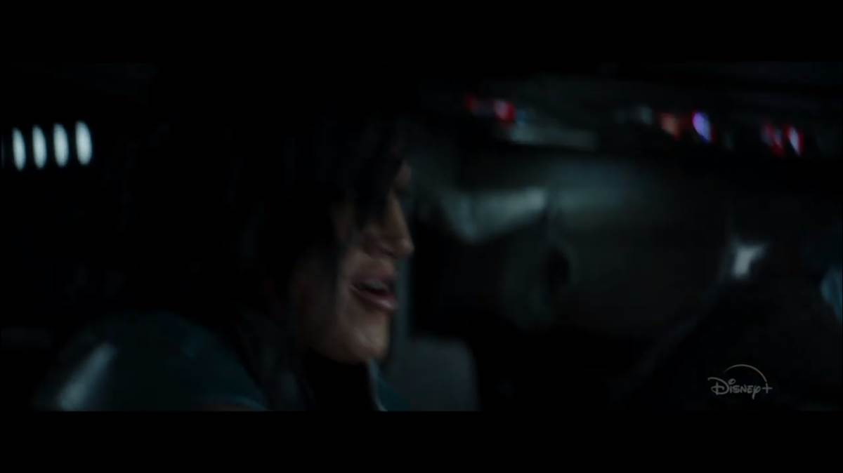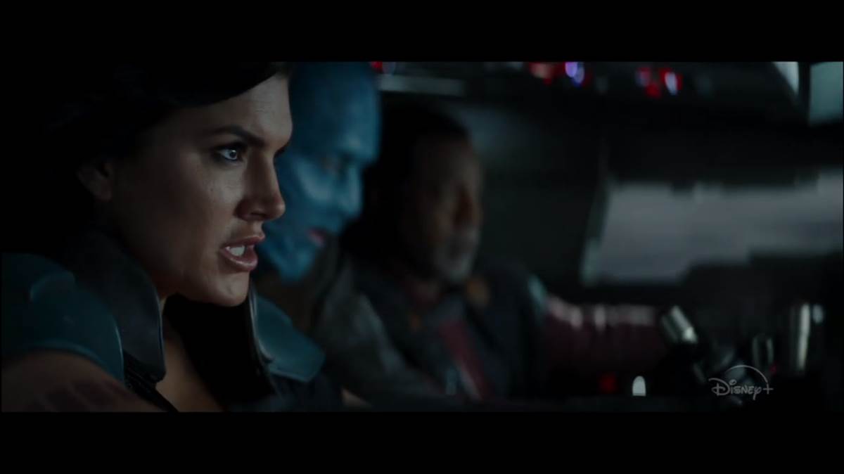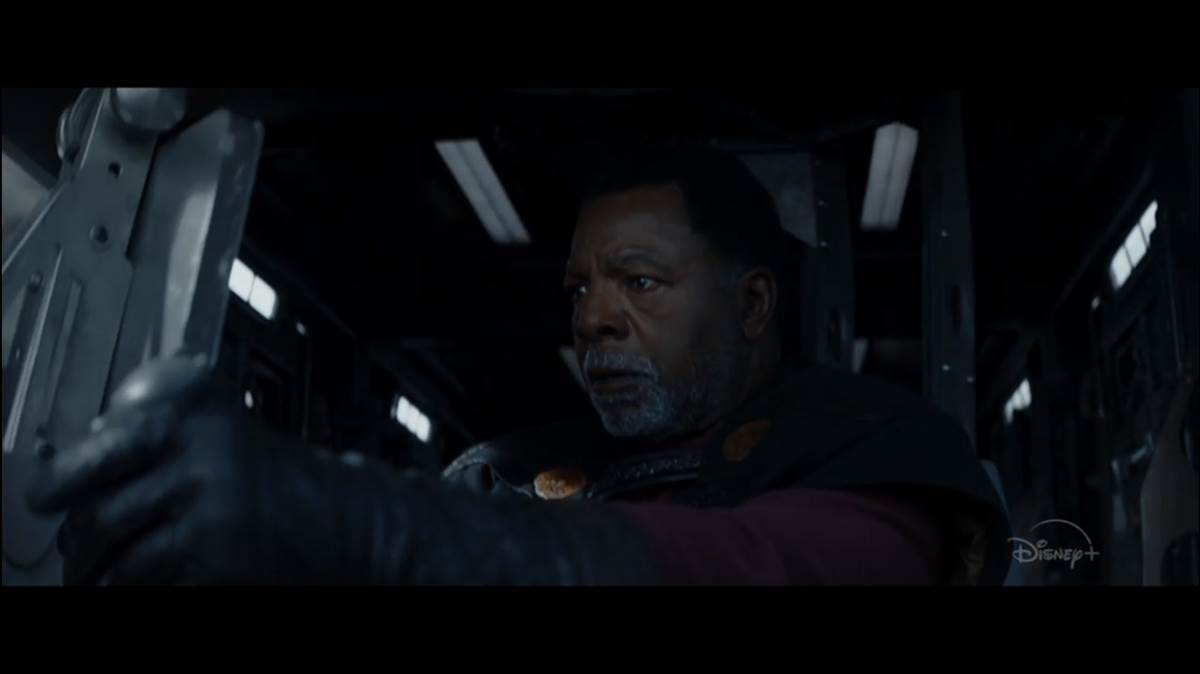 This is an interesting shot, as it reveals another Mythrol character (the same species played by Horatio Sanz in The Mandalorian’s very first episode, though it seems too skinny to be the same exact character) riding with Cara Dune and Greef Karga in the transport.