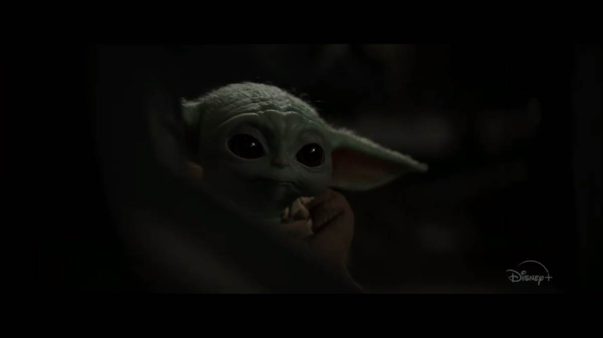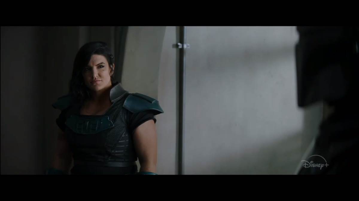 Mando approaches Greef Karga (Carl Weathers) and Cara Dune (Gina Carano) while holding The Child on Nevarro. In the hold of the Razor Crest, we see someone frozen in Carbonite. The line of dialogue playing here in the trailer is “I’m here on business. I need your help. I’ve been quested to bring this one back to his kind,” but I don’t think Mando is actually saying this to these two characters in the show, as they knew that bit of information already.