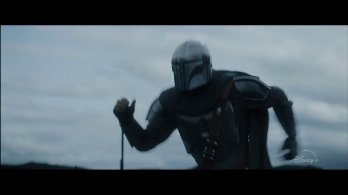 “Here we go!” Mando runs toward the canyon’s edge. The remaining shots of him igniting his jetpack and flying over the camera were used in the previous trailer.