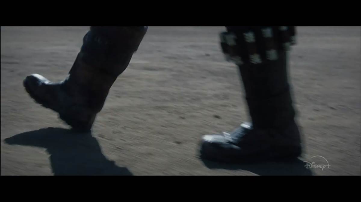 A shot of Mando’s boots walking on what I assume is the planet Nevarro.