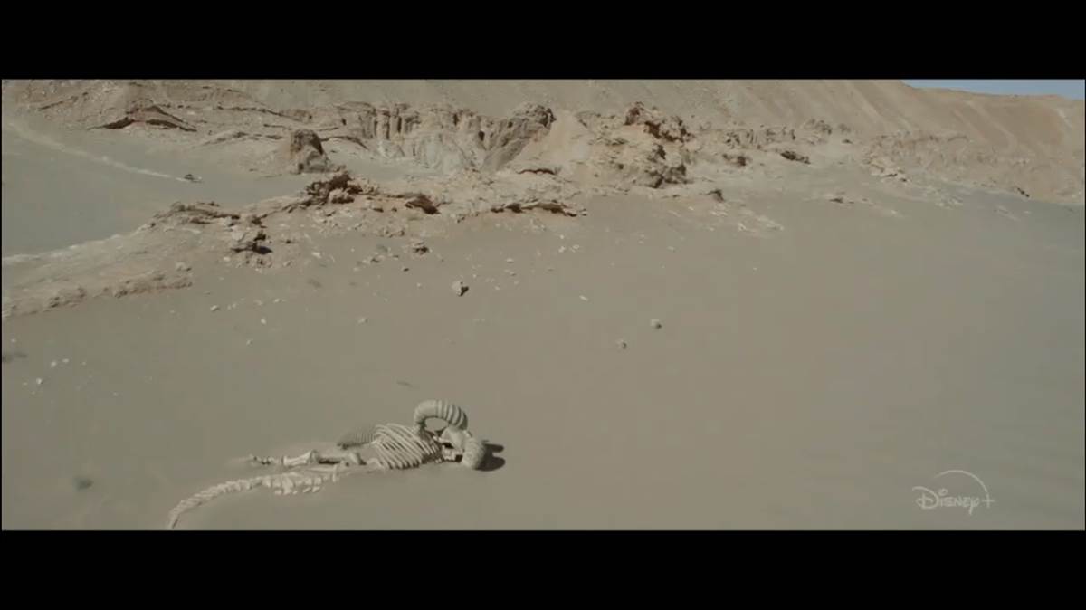 We see a bantha skeleton half-buried in the sand as the camera soars over craggy Tatooine terrain and Mando zips by on a speeder bike.