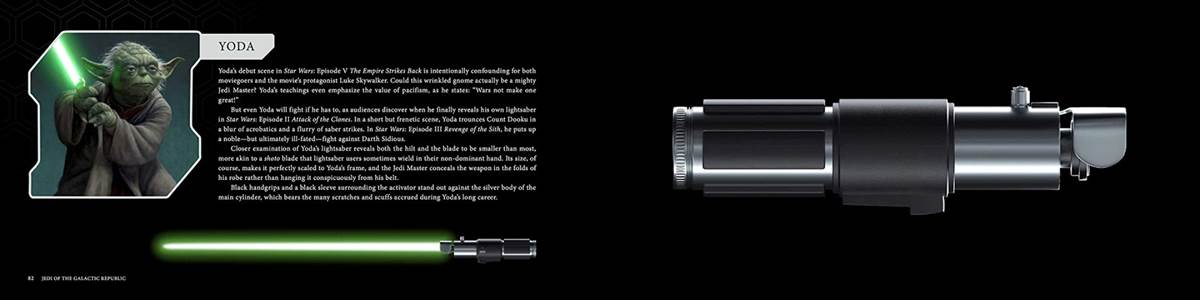 So we looked at those and we were like, ‘If there is an instance where two Jedi that we know happen to be carrying a stunt hilt and it’s more or less the same design, let’s take them out of the book so that we can showcase something different.’ One of those examples is from the animated series Star Wars: The Clone Wars. There’s a Wookiee Jedi who Lucasfilm suggested including, because the lightsaber design is carved from wood. The lightsabers we’re familiar with from the movies are made from a metal cylinder with pieces of electronics glued onto it. This will help us show the range and the cultural variation that you would see if this were something that different people designed to be meaningful to them personally, and they all came from different backgrounds. That’s one example that we included in this book to convey the importance of the lightsaber as a personal expression.