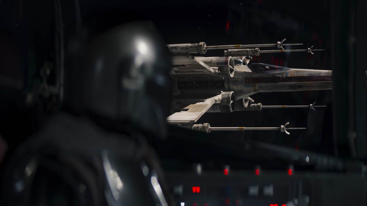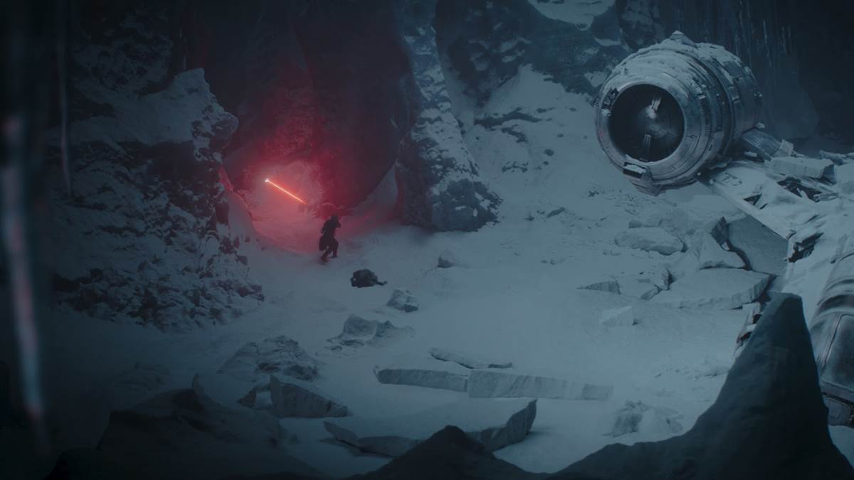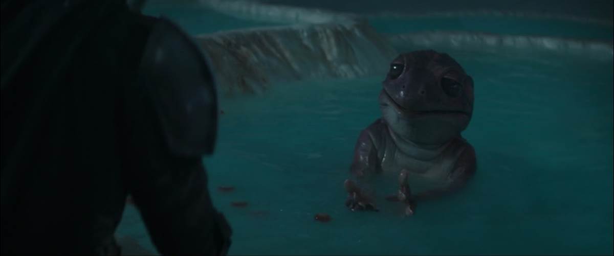 Of course, traveling at sublight speeds means the Razor Crest is open to threats, and the ship is soon flanked by a pair of New Republic X-Wing starfighter pilots (series producer Dave Filoni reprising his role as Trapper Wolf and guest star Paul Sun-Hyung Lee as new character Captain Carson Teva) demanding signal-based evidence that their quarry is not Imperial. When the pilots uncover the Razor Crest’s involvement in last season’s prison break and lock their S-foils in attack position, Mando makes a break for it and manages to evade the X-Wings, crash landing on an unnamed ice planet. The ship is badly damaged once again, and our hero spends a good amount of the remainder of the episode repairing it, but not before he’s interrupted by the frog-lady wandering off to bathe with her remaining eggs in a hot spring she discovers in a nearby cave.