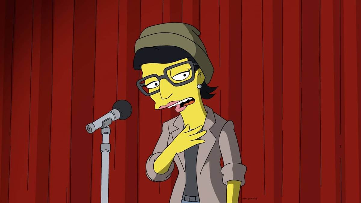 At the live podcast recording of “Interminable,” Lisa remarks that the host Tabitha Shingle (Christine Nangle) is “even more dry in person.” A Channel 6 news van pulls up outside and Kent Brockman (Harry Shearer) enters the theater. He’s shocked to see how popular the very boring-seeming host has become, then returns home dejected to find his entire family glued to their mobile devices. Later, Brockman reports breaking news that a woman is presumed dead after going overboard on a cruise-- Grampa’s girlfriend. Abe has been detained for questioning and Homer reacts: “Grampa, a killer? He doesn’t have that kind of follow-through!”