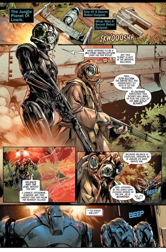 Valance and his ward Cadeliah (the daughter of two star-crossed members of rival Corellian gangs) have arrived on the jungle planet of Lowik, the site of a secret Rebel Alliance base that Beilert once helped arm, with hunters Zuckuss and 4-LOM in hot pursuit. The Gand and droid partners release a battalion of leftover B2-series super battle droids to raid the planet, while Valance seeks medical assistance from his former paramour Yura, who has married a man named Kondra in the time since Beilert abandoned her on Lowik years earlier.