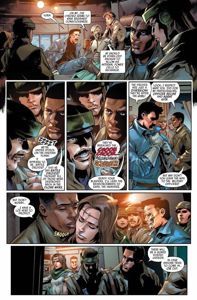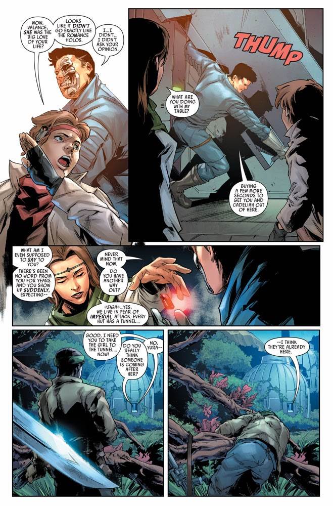 We get a flashback to Valance’s contentious departure, with Yura bestowing him with the treasured fire Ruby we’ve seen him carrying since the Star Wars: Target Vader comic miniseries. The local rebel military deals with the battle droids while Beilert gets patched up and then sends Yura with Cadeliah through a secret tunnel to their perceived safety. At that point 4-LOM shows up at Yura’s hut and he and Valance go at it for the requisite half-dozen pages. Then Zuckuss ambushes the two young women as they flee, but Beilert is eventually able to buy off the two bounty hunters by giving up a symbolic piece of his personal history. I guess it’s a tidy way to wrap up the Yura storyline, but the fact that he also leaves the seemingly-important Cadeliah on Lowik with the soon-to-be-evacuating rebels means we’ll be seeing those characters again down the line.