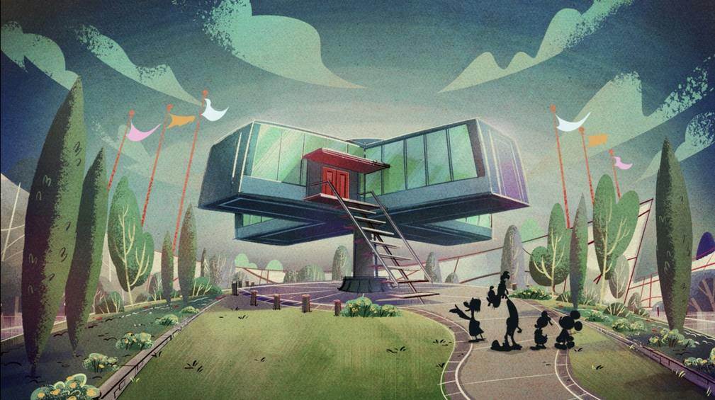 More Disneyland fun abounds in the second short, this one celebrating Disneyland’s past. It’s set in Tomorrowland of the 1950’s and the opening shot finds Mickey, Donald and Goofy walking past the old Hall of Science. If you’re a big fan of the Mickey Mouse series, it’s actually appeared in three shorts before (“Down the Hatch,” “Split Decision,” and “Outta Time”). It’s inspired by the 1955 attraction Monsanto Hall of Chemistry. That building is now the home of Star Tours.