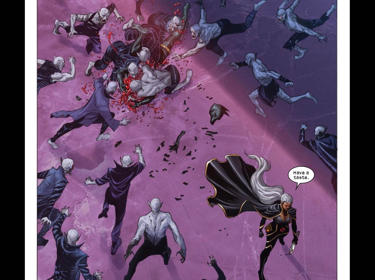 As you can see, Storm wins this fight and rather than gloating or panicking or dropping from exhaustion she simply gives the zombies a simple instruction as the calmly walks off: “have a taste.” In a story arc that has made things look pretty hopeless for the mutants of Krakoa, this one panel reminds you that Storm is on their side. And Storm is not going to lose.