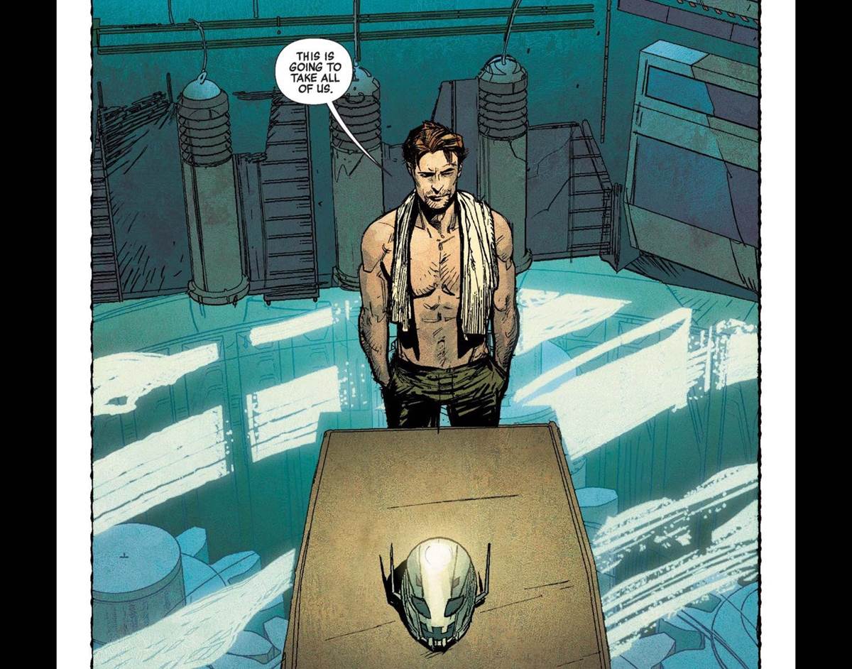 So in Bendis’ run on Moon Knight, the former Avengers was teaming up with Captain America, Wolverine and Spider-Man to take down a crime ring who may or may not be in possession of an Ultron. Only, as you find out here in this panel, none of those other heroes are actually there. Moony has been talking to himself and working alone this entire time.