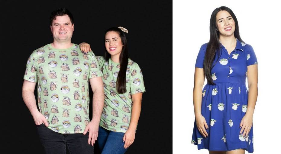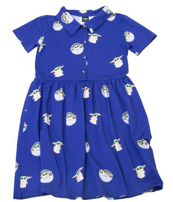 “Embrace the absolute cuteness of ‘Baby Yoda’ aka the Child, in this button up dress starring an all over print of the Child both in and out of his carrier!”