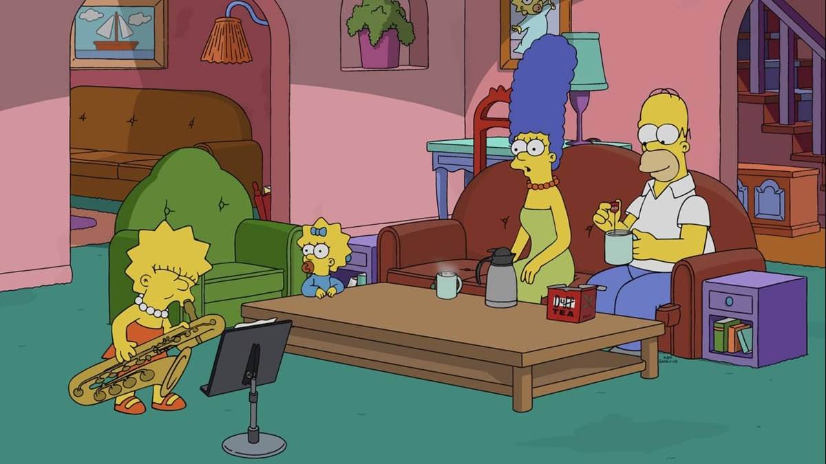The episode begins with Agnes Skinner (voiced by Tress MacNeille) bringing a wagon full of her son Seymour’s (Harry Shearer) belongings into the Android’s Dungeon to sell to Comic Book Guy (Hank Azaria). He finds a rare Radioactive Man action figure and sells it online so he can finally afford a trip to a comic book convention called Comicalooza he’s always wanted to attend, though he can’t also pay for his wife to go. At Springfield Elementary School, Lisa (Yeardley Smith) spots a new student named Blake (guest star Ben Platt of the Pitch Perfect movies) who plays saxophone: “I wouldn’t kick him out of the library for ignoring my shush.” In music class, she tries not to stare openly into his blue eyes. Mr. Largo (also Shearer) announces a chair challenge between the two students, and they have some witty banter between them. “Less meet-cute, more toot-toot!” chastises Largo.