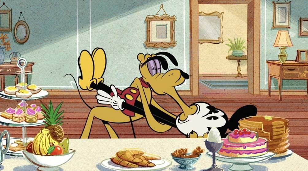 Mickey tries to trick Pluto into eating the medicinal treat, including karaoke and offering him a pancake buffet. Among the art in Mickey’s house is a framed portrait of the Steamboat Willie Riverboat from Mickey’s first short released to theaters.