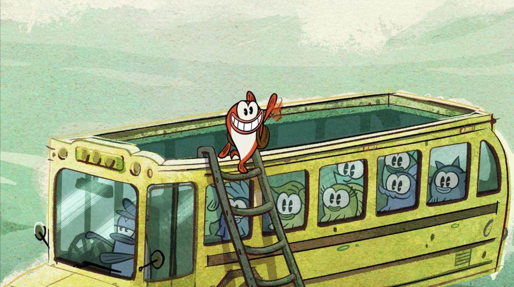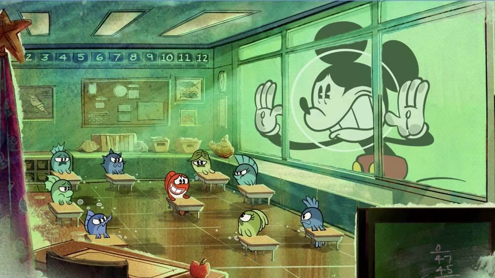 The next short centers around another one of Mickey’s pets, his fish Gubbles (I sure hope his bird, Tuppence, is doing well!). Mickey brings Gubbles to a pier on a lake in the middle of Central Park, where a fish school bus rises out of the water to bring his fish to his first day of school.