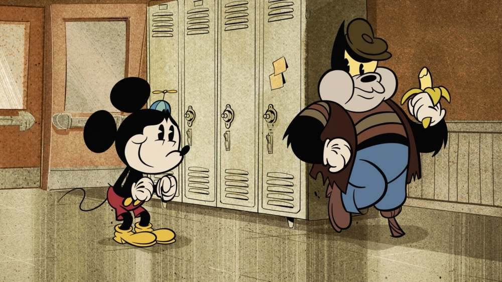 When Mickey sees other parents and kids playing in the park, he has a flashback to his own first day of school. We get to see bucktoothed Mickey meeting Minnie, Donald and Goofy and being bullied for the first time by Pete, who had his peg leg even at a young age.