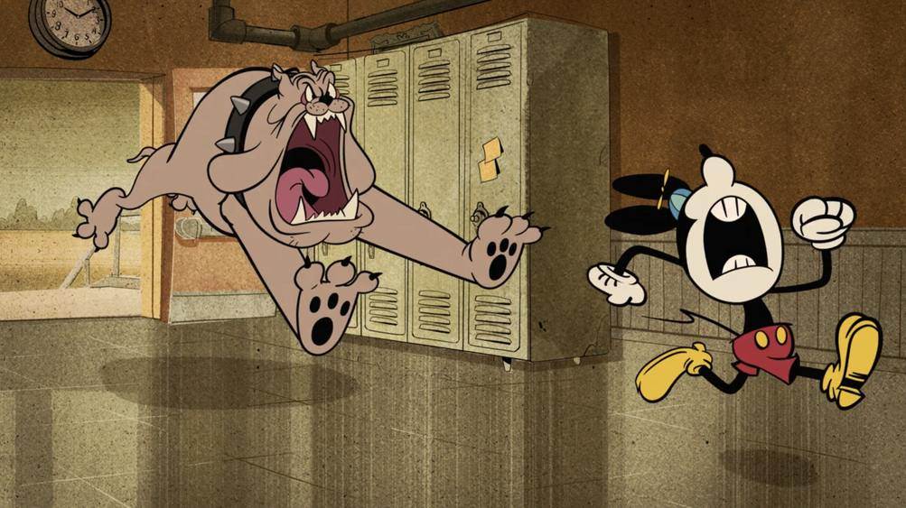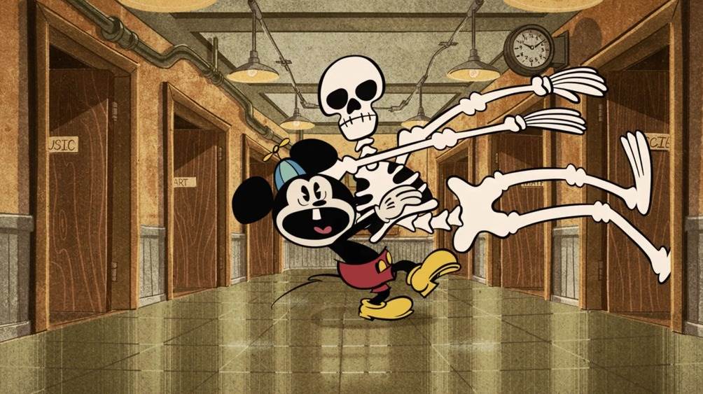 Pete throws his banana peel, which causes Mickey to slip down the hallway in and out of classrooms. He’s attached to a skeleton when he comes out of the first one, which is a cameo from the Silly Symphony short, The Skeleton Dance.