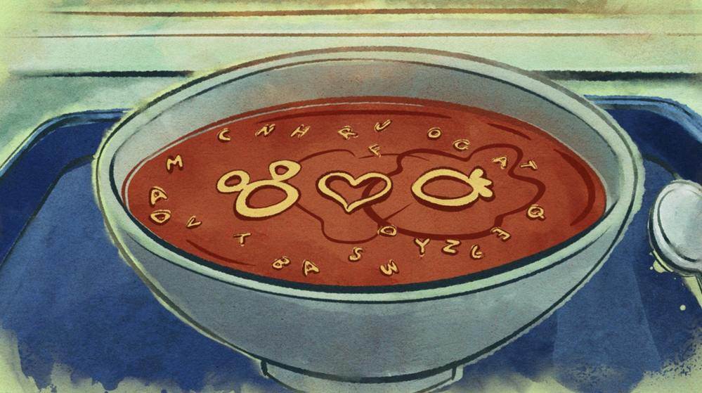 Disguised as the lunch person, Mickey even disturbs Gubbles’ lunch with a secret message in his alphabet soup.