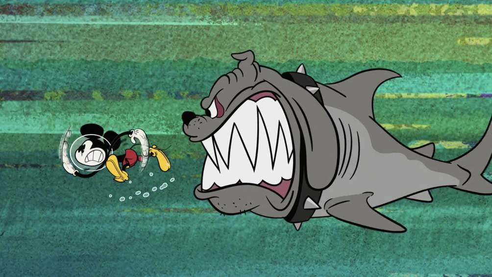 When Mickey follows him, he slips on an underwater banana peel and lets loose a bull shark (in fresh water) that bears a striking resemblance to Butch.