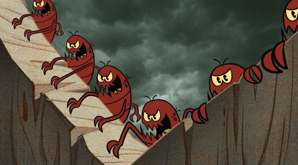 Returning home defeated, the original flea uses a bugle horn to call all his friends. The sky in these shots appears to be live action time lapse footage of storm clouds, which makes for a great effect.