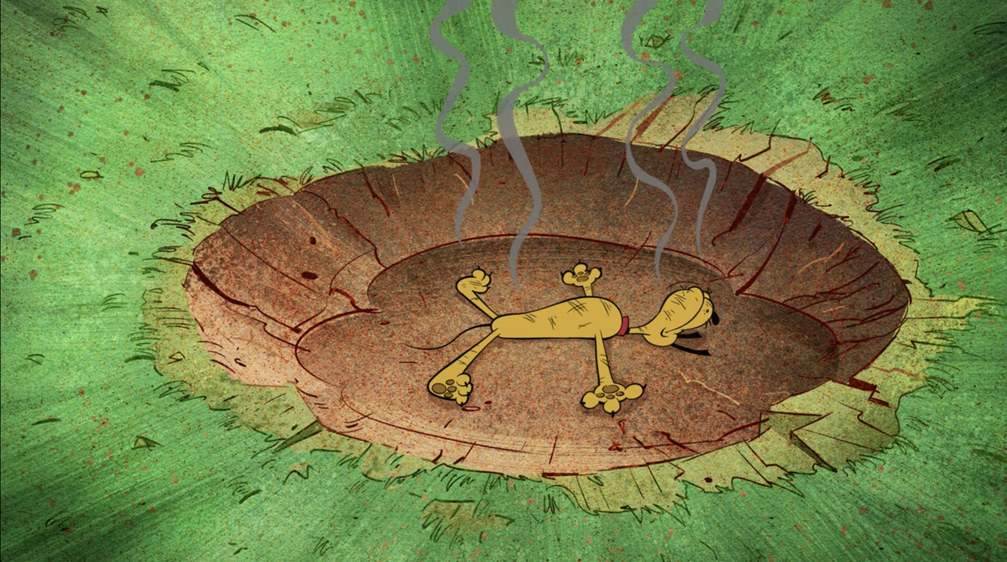 With the fleas attacking Pluto, a medieval tower appears out of nowhere, which Mickey climbs to fight off some of the fleas. When the chomping bugs assemble into an oven, Mickey throws the treat into Pluto’s mouth, which bounces around like a basketball in a hoop for suspense before going in. Almost immediately, a huge explosion decemates all the fleas and leaves Pluto in a crater. So that’s how Flea Gone works!
