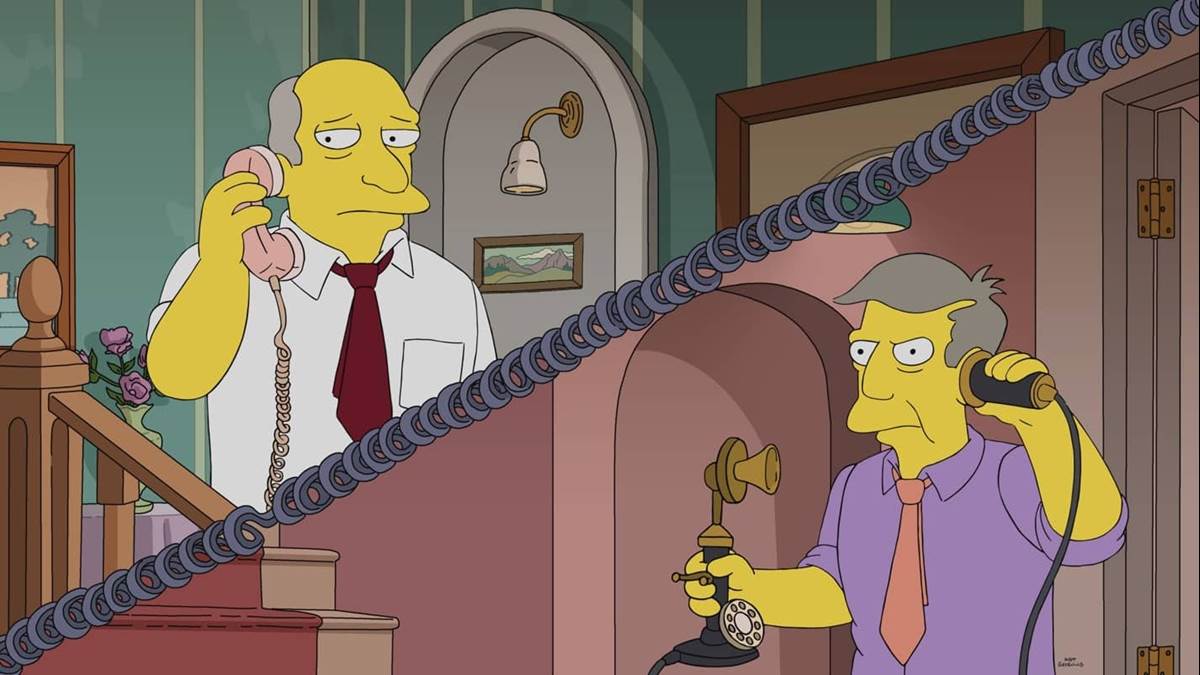 We open with a meeting of principals and Superintendent Chalmers (voiced by Hank Azaria). Principal Seymour Skinner (Harry Shearer) tries to one-up his fellow principals’ jokes, to no avail. Chalmers reveals he is giving the keynote address at a convention in Cincinnati and the budget allows for a plus-one, so he invites the principal with the highest test score. “That’s not fair-- Finch runs the School for Gifted Test-Takers,” says Skinner. Back at Springfield Elementary School, Principal Skinner practices his poor high-five skills while administering Bart Simpson’s (Nancy Cartwright) detention. Bart tries giving Seymour some advice on how to be more likeable. Superintendent Chalmers gets a call from Finch, who tells him he can’t make it due to food poisoning. Skinner pulls up in a taxi, having learned about Finch’s ailment on social media, and Chalmers reluctantly agrees to travel to Cincinnati with his least-favorite subordinate.