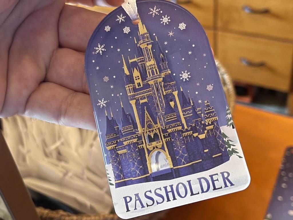 Fans will love the Christmas tree-shaped magnet that serves as the backdrop of a colorful, candy coated Cinderella Castle. Snowflakes give the scene a whimsical touch, and below the image is the word “Passholder” in all capital letters. This castle design is similar to the look on the phone case.
