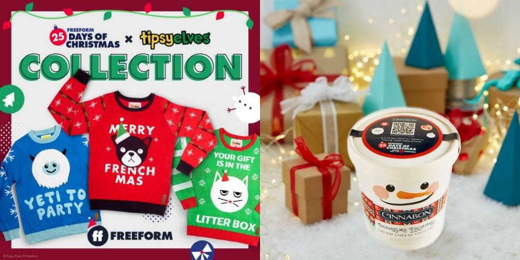 Freeform has teamed up with Cinnabon and Tipsy Elves to celebrate their 25 Days of Christmas programming. Grab a Freeform-branded pint of Signature Cream Cheese Frosting at participating Cinnabon’s or scoop up some ugly sweaters from Tipsy Elves featuring the Freeform mascots!