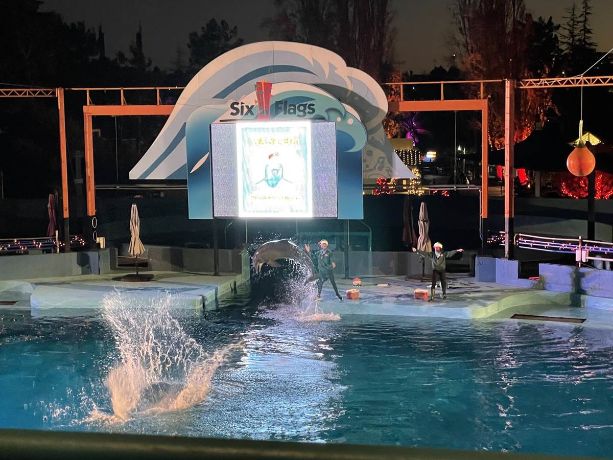 Next was “Wanted: Santa's Helper” where an elf was holding auditions for a dolphin to help pull his submarine this Christmas. Two dolphins competed, performing high jumps and hitting suspended targets. You’ll have to attend a performance to see who wins during your show. Seating in all shows are marked with dots instructing guests where to sit and team members walk around making sure everyone is on a dot to keep their distance in these outdoor seating venues.