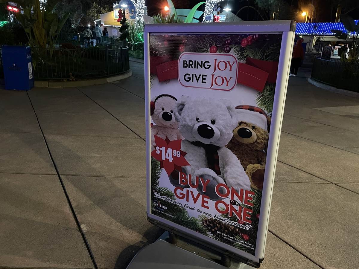 Six Flags Discovery Kingdom is also using Holiday in the Park Lights! to spread some holiday cheer. During the first weekend, a Contra Costa County canned food drive allowed visitors to make donations in exchange for free admission and park members could donate in exchange for holiday gifts instead, choosing from light-up ornaments or a hot beverage thermos. Throughout the event, Six Flags Discovery Kingdom will donate a teddy bear to local toy drives for each bear purchased.