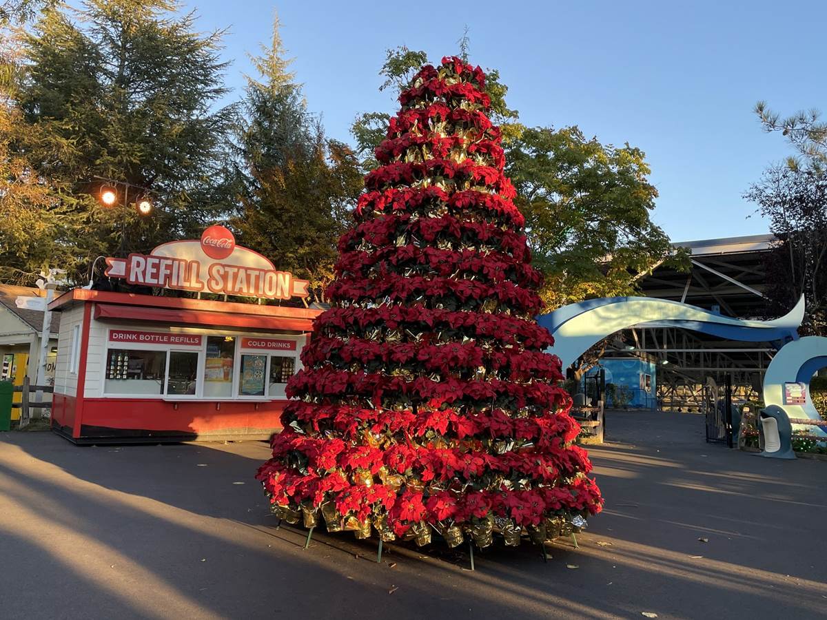 Most of the Christmas trees throughout the park don’t look that great until the lights come on, but this beautiful poinsettia tree near the entrance to both dolphin auditoriums was beautiful by day and by night when spotlights made it glow red.