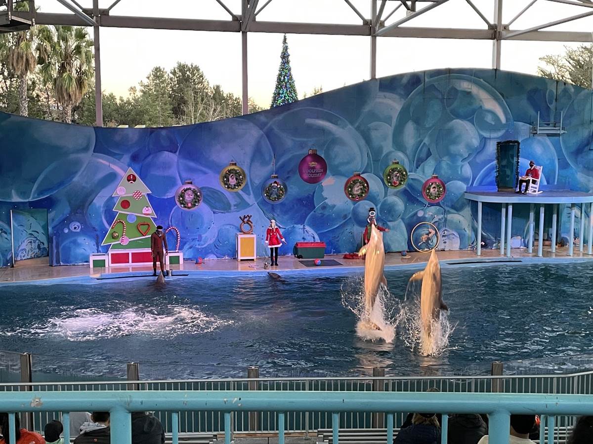 The first of the three shows we enjoyed was called “A Dolphin Holiday.” The set was decorated with a Christmas Tree and the dolphin trainers each dressed in holiday attire. A host read a narration as the dolphins did tricks and retrieved floating ornaments to decorate their tree.