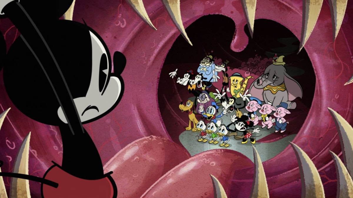 Putting up a fight, Mickey sees into the belly of the wolf and sees all his pals, plus a few other guests we didn’t see the wolf eat, like Dumbo and Timothy Mouse plus the saxophone prince from the Silly Symphony short Music Land. How did he get in there?